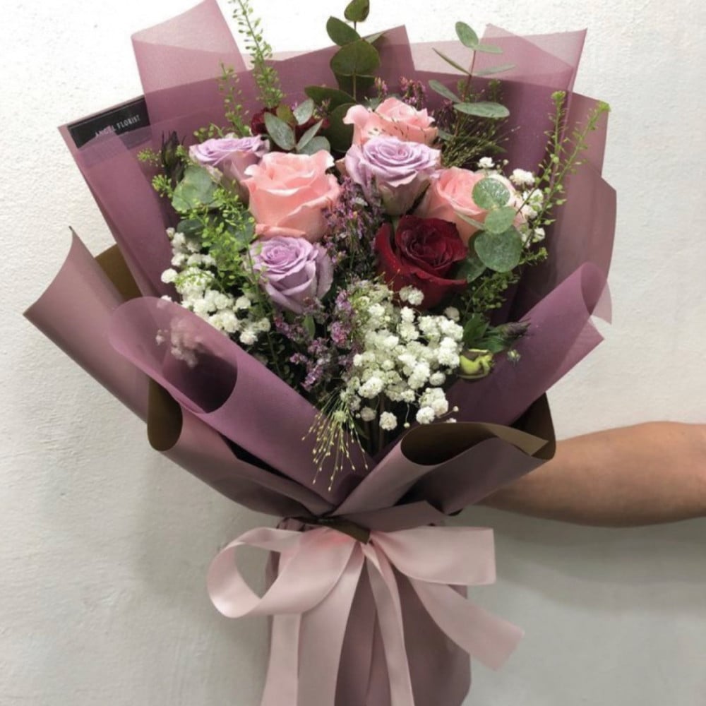 بوكيه ورد عباره عن الجوري الملون والجبسوفيليا مع الاعشاب الخضراء الهادئة.