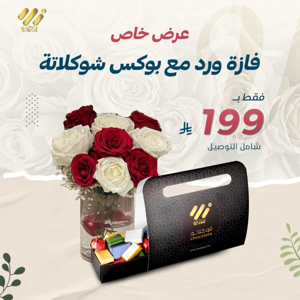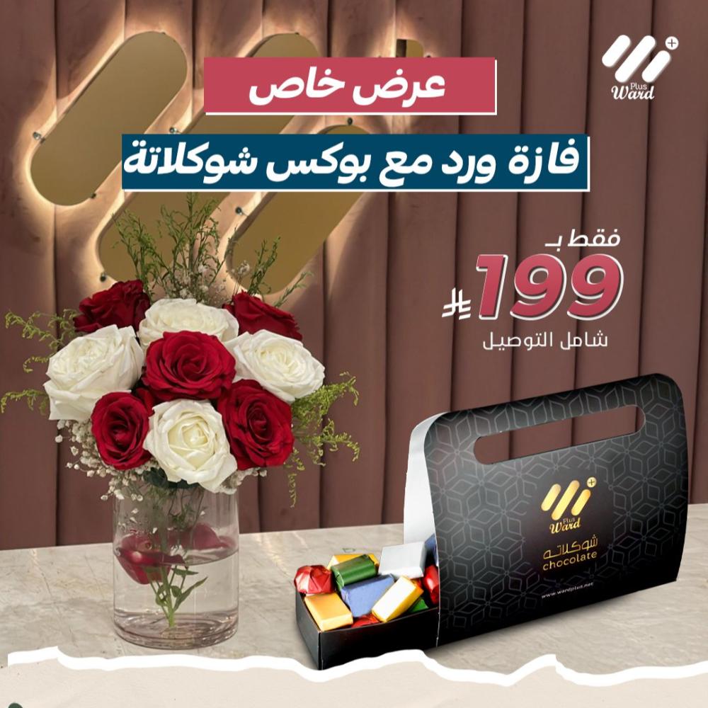 فازة ورد مع شوكولاتة فاخرة بـ199 ريال فقط – شامل التوصيل!