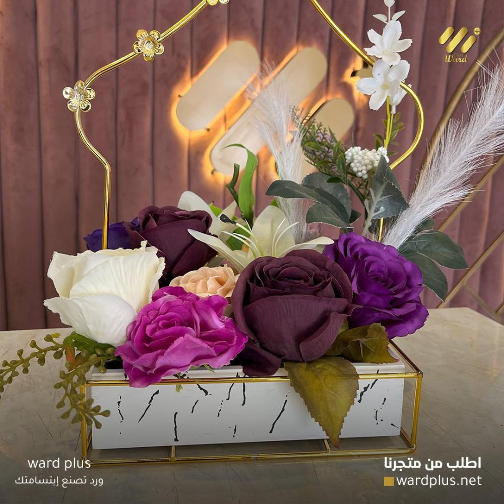 تنسيق ستاند رخامي على شكل هرم مزخرف يحتوي على ورود الجوري الصناعي والبيبي روز الصناعي.